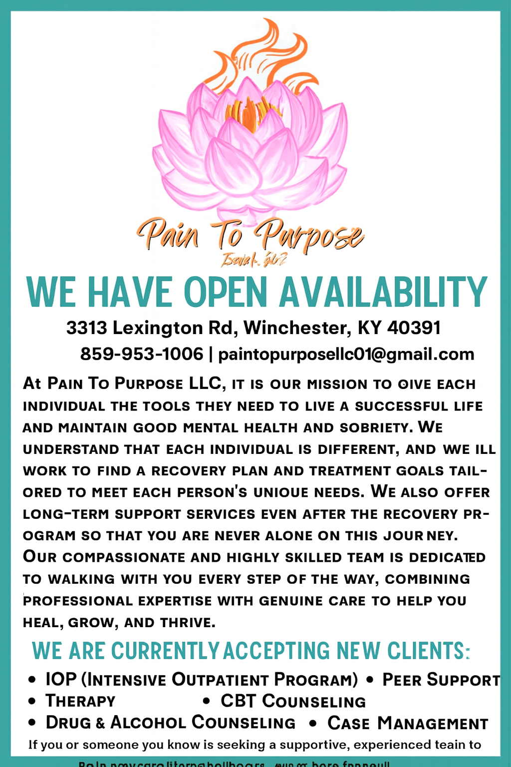 At Pain to Purpose, this isn’t just a job — it’s a calling. Our lived experience, professional training, and genuine passion for transformation create an environment where clients don’t just survive… they grow, heal, and thrive.